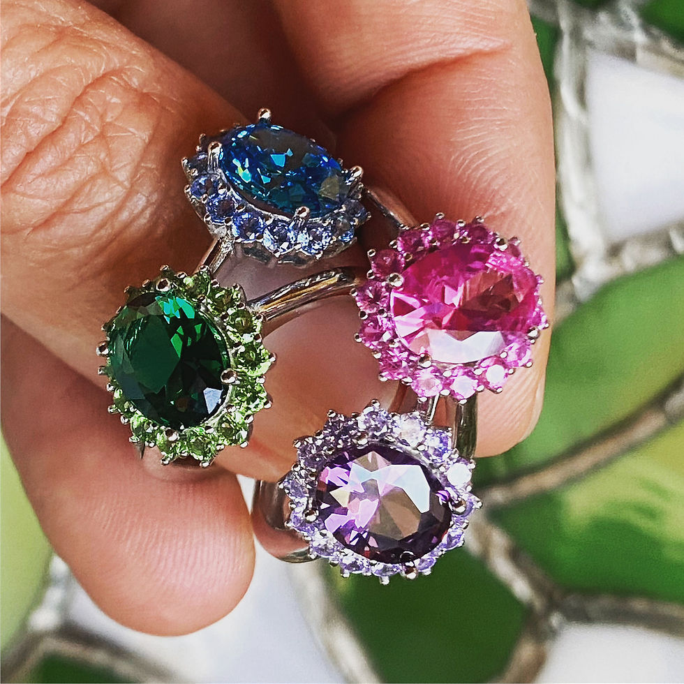 Anelli regolabili con pietra tonda sfaccettata e gambo puntinato smaltato
