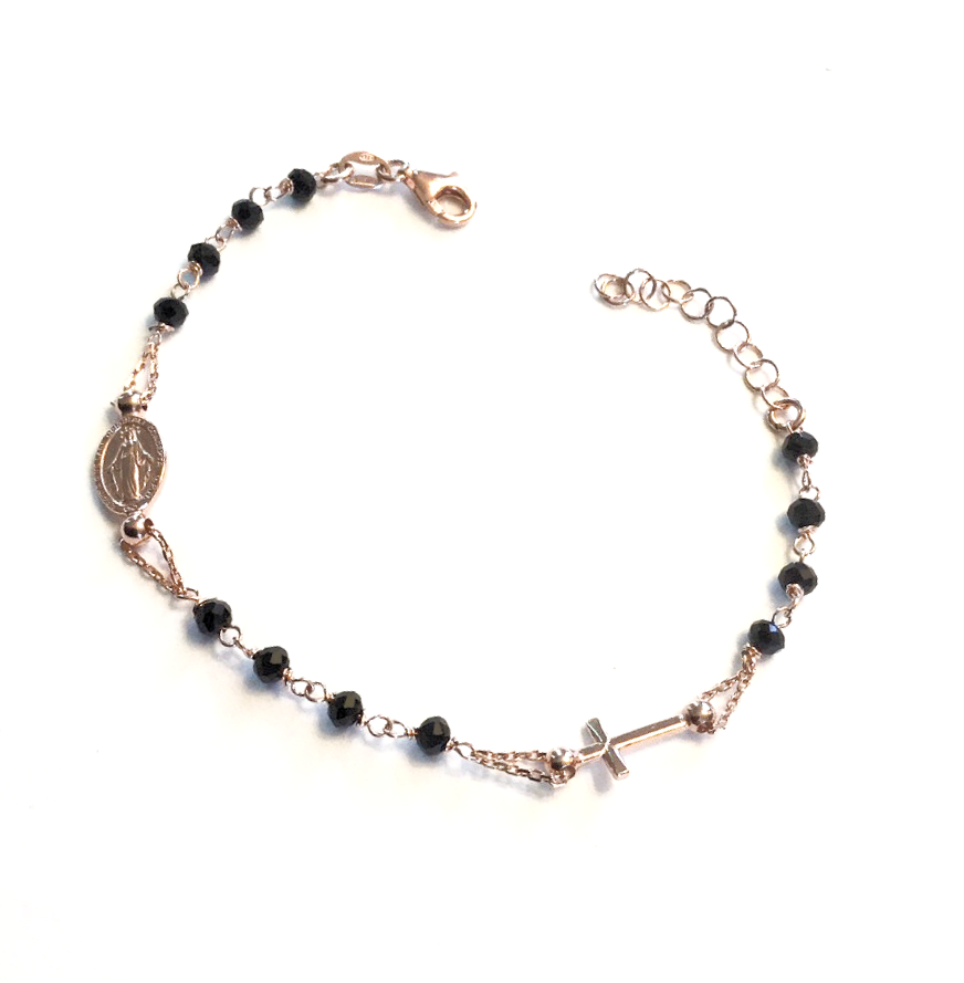 Rosario con piedras negras con madonnina y cruz pequeña insertada